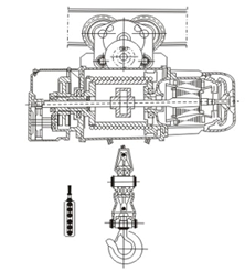 CD1型電動(dòng)葫蘆主要結(jié)構(gòu):減速器,運(yùn)行機(jī)構(gòu),卷筒裝置,吊鉤裝置,聯(lián)軸器,軟纜電流引入 器,限位器.電機(jī)采用錐形轉(zhuǎn)子電動(dòng)機(jī),集動(dòng)力與制動(dòng)力于一體.